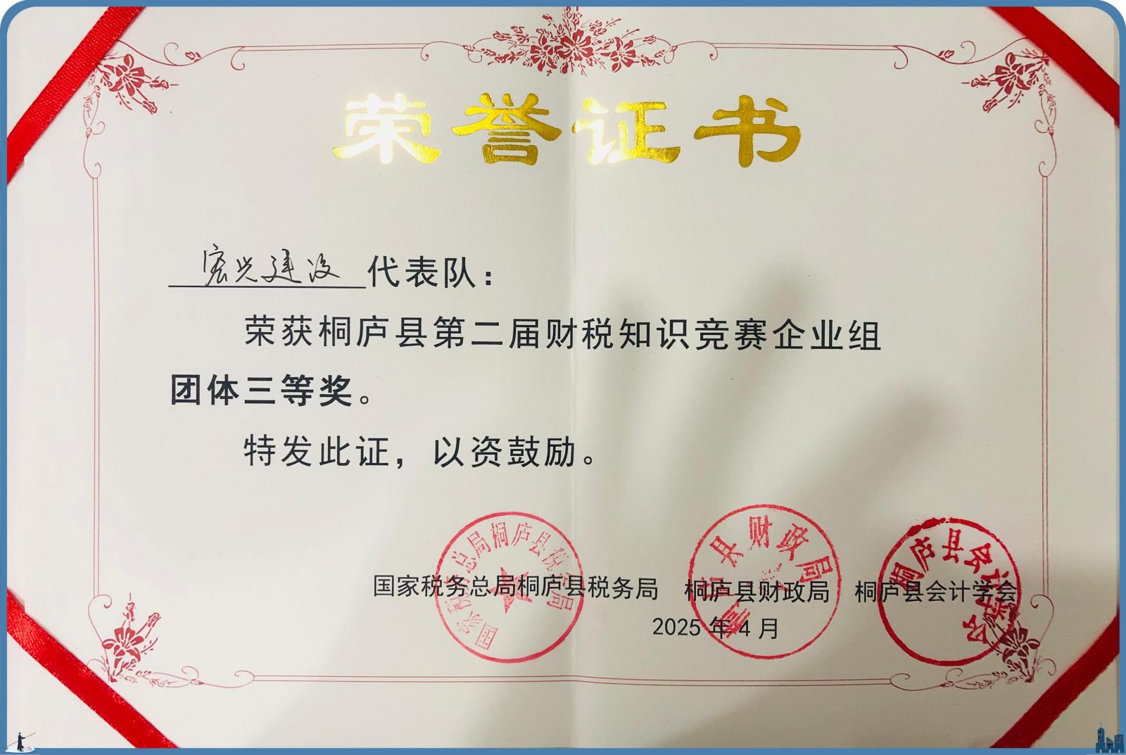 我公司由財(cái)務(wù)總監(jiān)領(lǐng)銜的5人精英團(tuán)隊(duì)?wèi){借扎實(shí)的專業(yè)功底與默契的協(xié)作精神脫穎而出。繼去年勇奪“團(tuán)體第二名”后,今年再創(chuàng)佳績(jī):斬獲“團(tuán)體三等獎(jiǎng)”,團(tuán)隊(duì)成員毛衛(wèi)麗榮獲個(gè)人一等獎(jiǎng),池秋俠榮獲個(gè)人二等獎(jiǎng),展現(xiàn)了團(tuán)隊(duì)在財(cái)稅領(lǐng)域的深厚積累與持續(xù)突破。